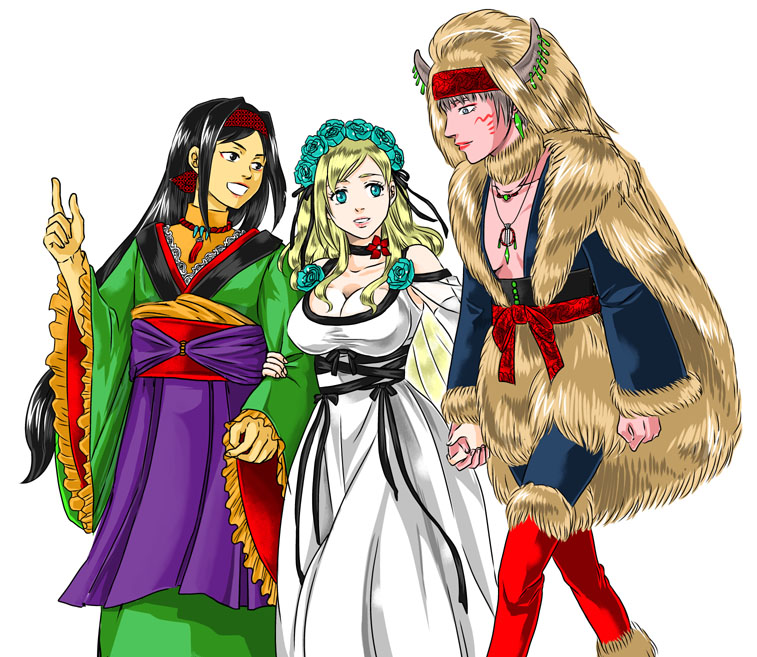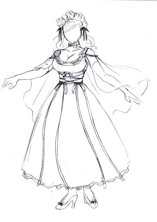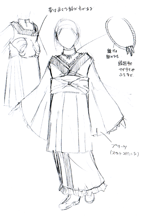新年や祭などの特別な行事でのみ着用されます。房のついた組みひもの首飾りは縁起物で、通常はこういった伝統衣装にのみ合わせるものです。日常的には金属や貴石を使ったネックレスやペンダントをつけています。かつては袖や襟、裾の部分にレースはついていませんでしたが、同盟国であるエレハイドの文化が伝統衣装にも影響を及ぼし、現在の形になりました。日常では胸元の開いた平服やパテン風のドレスを着用します。ここには国教であるパテン教の影響が色濃く見られます。