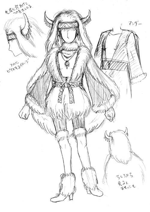 バラバルノ北部の豪雪地帯にある湖の近くに小さな集落を築いて暮らしていたロップノ族の民族衣装です。パテンのドクターの巡回によってパテン風の服も流入しており、日常的には伝統衣装とパテンの服をミックスで着用していました。新年などの重要な祭事においては正式な形の衣装を身にまといます。毛皮は寒さをしのぐだけでなく身体を大きく見せるので、角つきの帽子と合わせて他部族への威嚇になるとして好まれました。また、湖にはぐくまれたロップノ族は湖の白鳥を自分たちの種族の象徴としており、それは額飾りや帯などに描きこまれています。湖で簡単に拾うことが出来るヒスイを磨いた装飾品も、湖の恵であるとして多く用いられました。