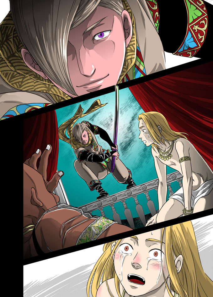 俺の人生で一番の幸運について、話そうか。 俺がペルーザで踊り子をしてた頃のことだ。 午後の公演は夕刻前にフィナーレを迎える。踊り子たちは花束と喝采に見送られて楽屋へと戻り、化粧直しを始める。客を迎えるためだ。客、といってもこちらの客は公演の観客とは違い、彼女らの踊りが目当てではない。気に入った踊り子の娘を選び、春を買うのだ。彼女らのあがりはみんな座長が一手にかきあつめ、彼女らにはびた一文入らない。だが金回りのいい男に気に入られれば舞台での出番も増える。独演を任されて一身に喝采を浴びることは彼女たちのあこがれだ。踊りにそれほど熱心でない娘なら、上手く立ち回って金持ちの妾になり、この一座から出て行くことを夢見る。思い思いに描く成功のために、彼女らは鏡の前で一生懸命練習した花のような笑顔で買われていくんだ。 俺には、幸いと言っていいのかそういった客がついたことはない。俺はいつも残った者と一緒に、彼女らが居なくなった後の楽屋を片付けたり会場を掃除したり、下働きをして過ごしていた。 だがその日は違った。豪奢な金細工を着飾った巨漢が、衣装を運ぶ俺の前にでんと立ちふさがる。身なりからすると、ペルーザ貴族だろう。 誰か意中の娘を探しているのかと思い、俺はそのように尋ねた。だがそいつはニタリと歯を見せて笑い、出し抜けに俺の髪を鷲づかみにしたんだ。 俺は驚いて抵抗したが、五月蝿い黙ってついて来い、と一喝された。背筋が寒くなったよ。俺はおそらく、こいつに買われてしまったんだ。 男が男を買ったら、パテンの法では死罪だろうって? そうだな、でも、当時の俺ぐらいの歳の少年が男に買われるのは珍しいことじゃない。女が少なかったり、女人禁制の場所だったら、美少年や美青年が女の代わりをするのも普通のことだ。まあ単純に男を目当てに来る奴もいるけど。法の目をかいくぐって上手くやっているんだろう。それに、同性と姦淫した咎で裁かれた事例は、だいたい政治的な遺恨や個人的な怨恨なんかがからんでるものさ。気に入らない奴を処刑するための口実にもってこいなんだよ。 珍しいのは、女の踊り子が沢山いる中で地味な顔をした男の俺が選ばれちまったって事だ。髪をひっつかまれた感じからして、ペルーザでは珍しい俺の金髪と白い肌が目当てなのかもしれない。だが、こんなふうに扱われると嫌な予感がよぎる。ただの性交が目的ではないという可能性だ。ペルーザでは白人の踊り子や娼婦は珍しくて、珍重される。しかしその反面、彼女たちは陰惨な暴力に晒されて、正気を失ったり命を落とすことも多い。どちらも、白人種の国の代表格であるパテンに対する感情の表れだ。パテンは千年にわたり世界の覇権を握っていて、それを未だ他国に侵されたことはない。パテン人というのは恐ろしく優位性のある民族だ。そこに憧れるも憎悪するも紙一重なんだろう。 俺の髪をつかんでいるペルーザ貴族、こいつはどっちだ。もし憎悪する側だったら、どうなる。俺はみなし子で、最下層の人間だ。壊されたって殺されたって誰も気に留めない。こいつも罪に問われたりしないだろう。ほんのはした金を座長に支払えば、それで何もなかったことになるんだ。 俺は怯えのあまり暴れたが、打ち据えられて担ぎ上げられ、そいつの寝所に連れ込まれてしまった。乱雑な扱いで寝床の上に放り投げられる。俺はすぐに起き上がって、男にやめてくれるよう懇願した。命乞いだった。 聞き入れられるわけもないよな。俺はただの商品だ。男は座長に金を払ったのだろうし、俺に情けをかける謂れもない。男はどっかりと寝床に腰を下ろし、まっくろい瞳で俺を見ている。口元をにやつかせながら、俺が必死に言いすがるのを眺めている。間違いない、殺される。よくても、二度と踊れない体になるだろう。 男の太い指が、にゅっと俺の髪へと伸ばされる。 もう、だめだ。 観念して身を固めた、そのときだった。 「やめたまえ!」 鮮烈なほどに張りのある声が、耳を突き抜けた。 声の主はベランダにいた。月明かりの下、恐ろしく背の高い人間のシルエットが手摺の上に立っている。 魔物かと見まがう、異様な光景だった。もちろんここはペルーザの首都なのだから、強力な結界によって夜といえども魔物は立ち寄れない。しかし、そう思わせるだけの威圧感がその影からは放たれていた。 長い手足をぐっと折り曲げて、影が低い姿勢をとる。月明かりが雲間を抜けて、影が光に晒されていく。 ![]() 淡い色の髪、夜目においてなお赤みがかった肌、そして長い手足に見上げるような上背。男は一目でバラバルノ人とわかる容姿をしていた。 バラバルノ人と言えば奴隷の代名詞のようなものだ。俺の友人にもバラバルノ人奴隷が数人いる。彼らは、最下層の人間である俺よりも過酷な扱いを受け、蔑まれながら生きている。それなのに、目の前のバラバルノ人のなんと毅然としたことか。 バラバ